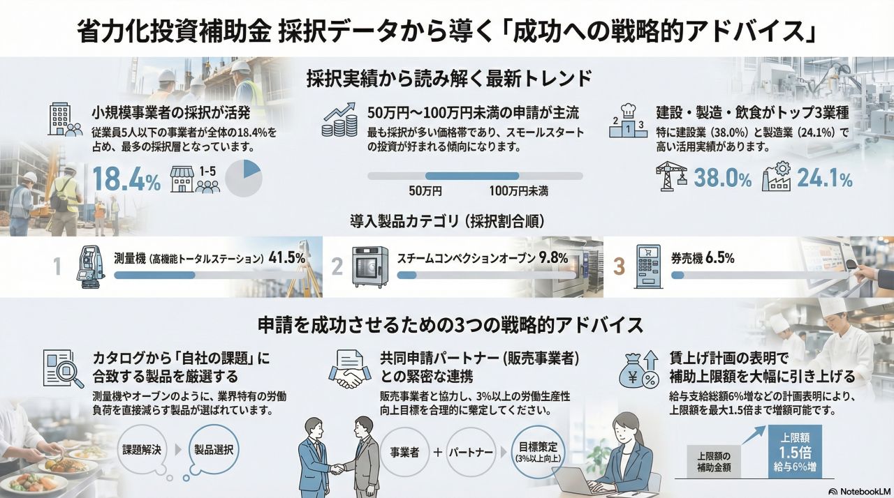中小企業・小規模事業者の皆様から注目を集めている「省力化投資補助金(カタログ型)」について、2025年12月時点の最新データを基に、採択傾向の分析と申請に向けた戦略を解説します。