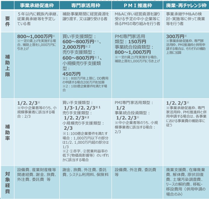 事業承継・M&A補助金(14次公募)は、以下の枠が実施されます。